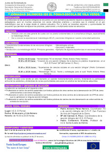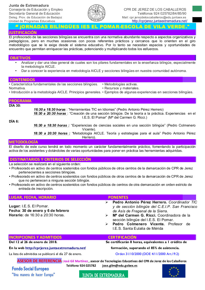 Como parte de las actividades enmarcadas dentro del proyecto Erasmus+, los días 30 de enero y 6 de febrero se celebraron las Jornadas Bilingües IES El Pomar-Escola de Vila Verde. En ellas, los participantes pudieron aprender cuales son los pilares fundamentales en la enseñanza bilingüe, especialmente en lo referente a la metodología AICLE. Además, pudieron conocer las experiencias en metodología AICLE y en secciones bilingües de la mano de tres docentes: Pedro Antonio Pérez Herrero (Coordinador TIC y de sección bilingüe del C.E.I.P. San Francisco de Asís de Fregenal de la Sierra), Mª del Carmen G. Ricci (Coordinadora de la sección bilingüe del I.E.S El Pomar) y Pedro Colmenero Vicente (Profesor del I.E.S Santa Eulalia de Mérida).